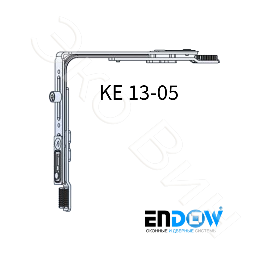 Угловая передача Endow KE-13-05 - это соединительный элемент поворотно-откидной системы, предназначенный для изменения направления движения фурнитурных тяг под углом 90 градусов. Данная деталь устанавливается в углах створки и обеспечивает синхронную работу запорных цапф по всему периметру окна.